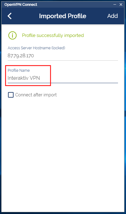 Nach dem Importieren kann, wenn gewünscht, der "Profile Name" der Verbindung nach Belieben angepasst werden. Anschließend in der oberen rechten Ecke auf "Add" klicken.